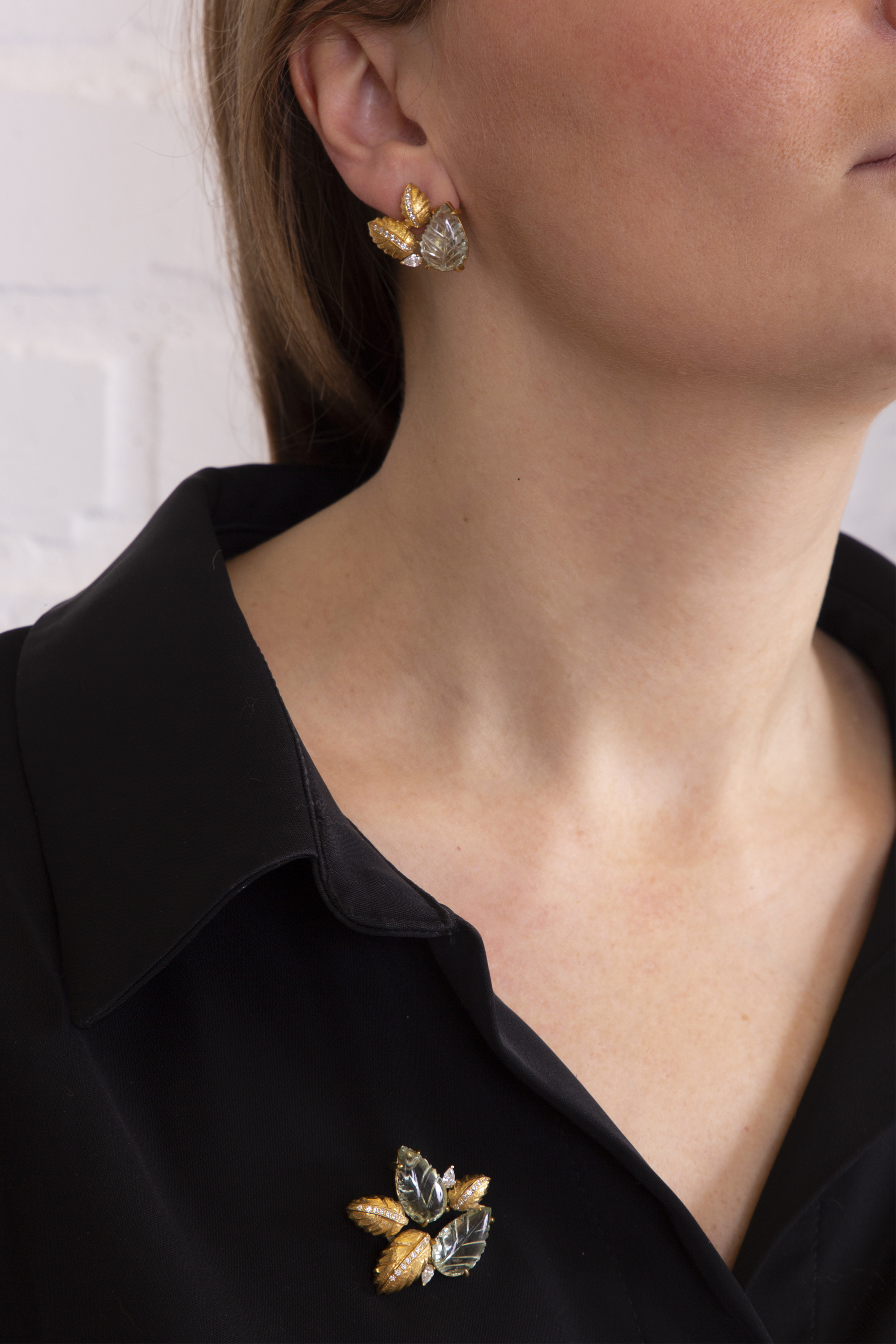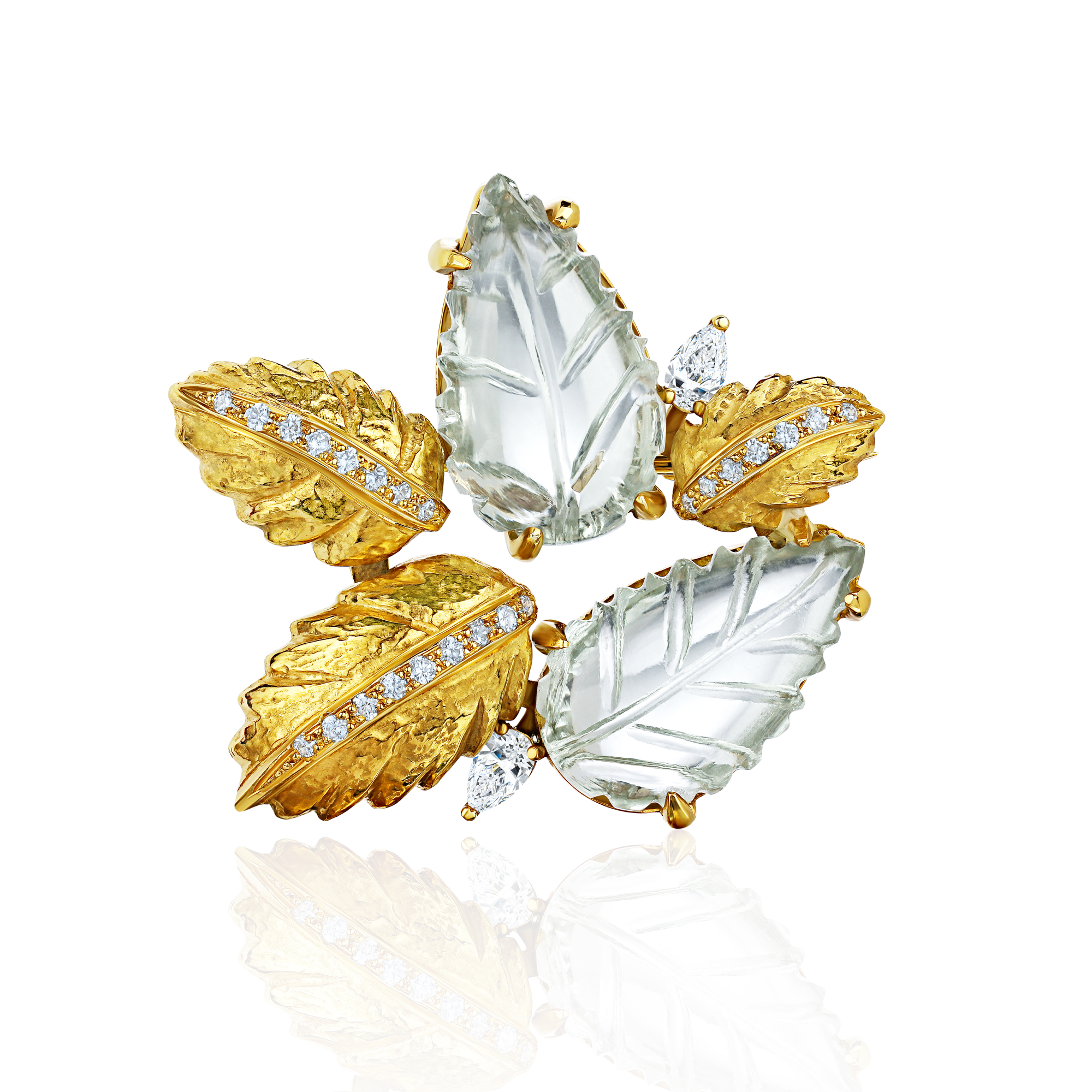 Брошь "Мята" выполнена из серебра 925 с позолотой 24карата, резным зеленым кварцем и лабораторными бриллиантами, полностью ручная работа